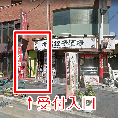 ⑥バス停を越えると【料理:餃子酒場】が見えてきます。そちらのビル左手にある緑色の扉が受付となっております。
